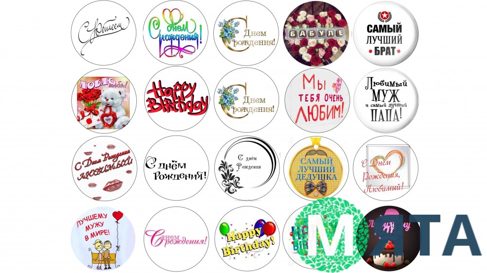 Чудова їстівна картинка для прикраси частування з нагоди Дня народження. Більш святкової картинки на цю тематику Вам не знайти, адже тільки на одному цьому малюнку знаходяться привітання відразу і для дідуся з бабусею, і для тата з братом, і для чоловіка. Крім цих персональних привітань є так само і просто душевні написи «З Днем народження!», «З ювілеєм!», «Ми тебе любимо» і так далі, які можуть послужити відмінним доповненням до святкового настрою. Як бачите, з цією харчовою картинкою Ви зможете ощасливити всіх своїх близьких та улюблених людей!