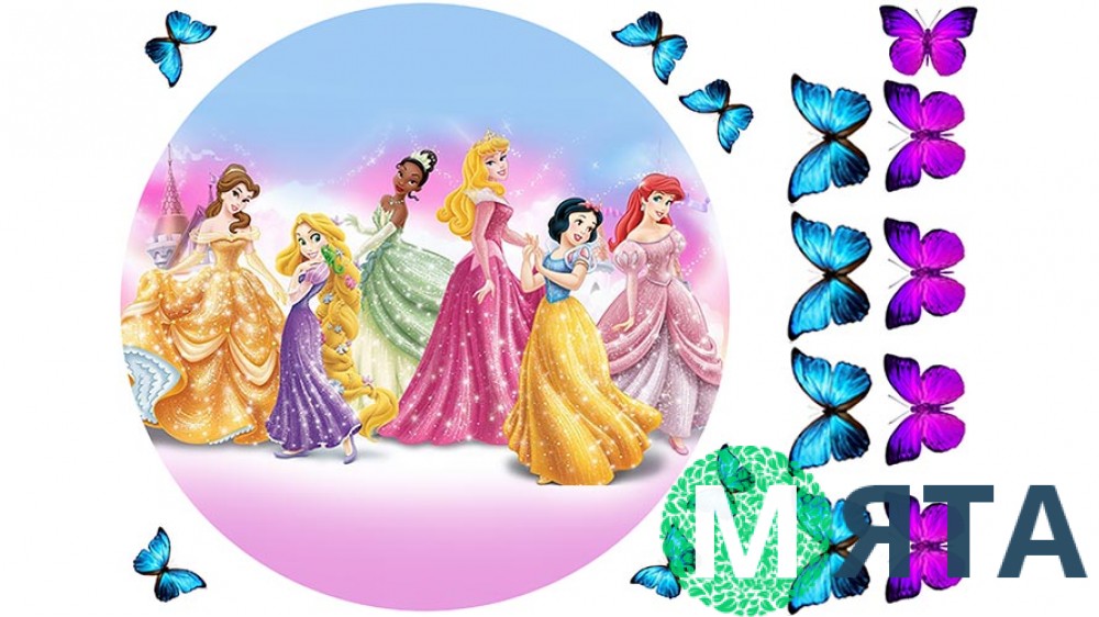 Прекрасна їстівна картинка з не менш прекрасними принцесами Диснея: Белль, Рапунцель, Тіана, Аврора, Білосніжка і Аріель. Ці улюблениці мільйонів дівчаток готові прикрашати святковий іменинний тортик для Вашої маленької принцеси. Вони навіть одягли свої найкращі сліпучі сукні. Щоб саме ці діснеївські красуні прикрашали святкову випічку від Вас, потрібно зовсім небагато. Акуратним і спритним рухом руки Ви наносите харчову картинку на поверхню свого виробу і все - тортик готовий тішити собою всіх, а особливо іменинницю. Яскраві метелики допоможуть доповнити чарівний святковий образ.