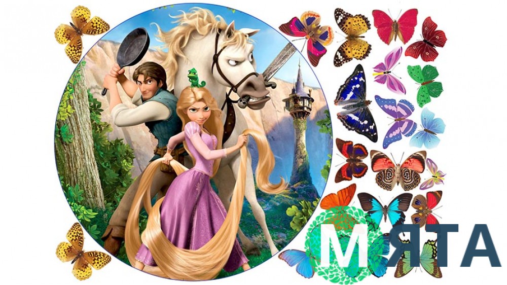 Лише побіжного погляду на цю харчову картинку достатньо, щоб одразу уявити чудовий тортик, прикрашений нею. Справді, з харчовими картинками інакше й не буває – ними можна успішно прикрасити будь-яку, навіть найпростішу і скромну домашню випічку, і готовий результат радуватиме око своїм апетитним та креативним виглядом. Дана їстівна картинка стане Вашим найкращим помічником у приготуванні особливого тортика для маленької принцеси. Тут зображено головних героїв чергового шедевра від Діснея – мультфільму «Рапунцель». Ці мультяшні персонажі зможуть якнайкраще прикрасити святкову випічку до Дня народження, а барвисті метелики тільки доповнять яскравий образ випічки.
