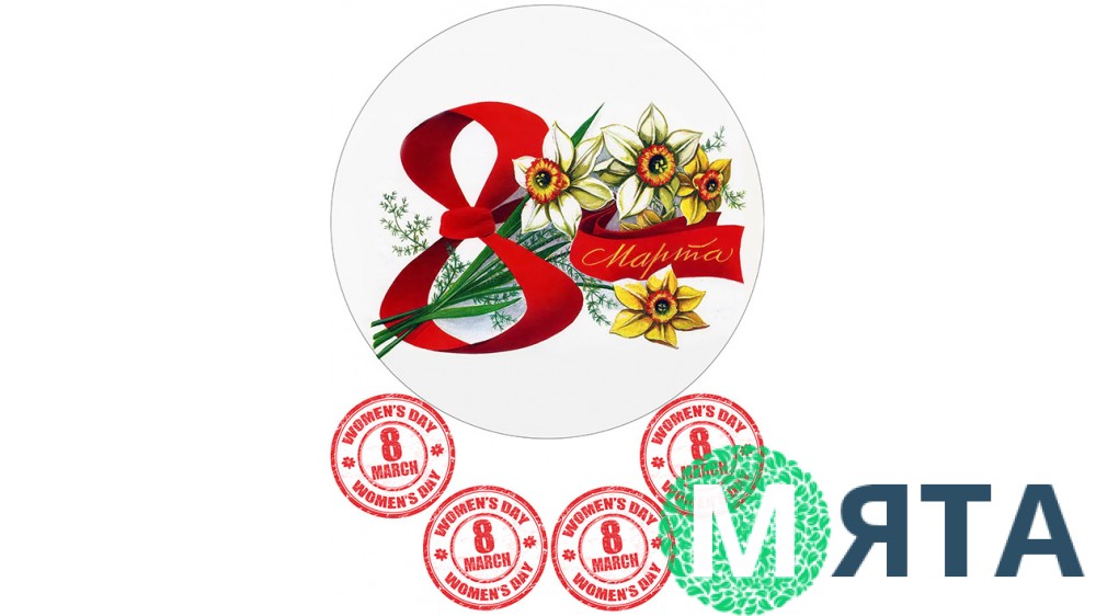 Картинка-вітання з 8 березня може бути надрукована на цукровому або рисовому (вафельному) папері. Діаметр великої круглої картинки близько 20 см, маленьких кружечок – 5 см. Білі та жовті нарциси, перев'язані червоною стрічкою за формою вісімки – гідна прикраса для торта на честь такого важливого свята, як міжнародний жіночий день! 4 кружечки, виконані в стилі друку-відбитка можна пристосувати для боків торта або прикрасити ними капкейки.