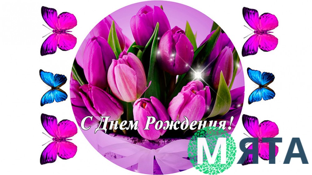 Така чарівна їстівна картинка допоможе Вам створити до Дня народження воістину модний та стильний святковий тортик. Шикарний букет незвичайних фіолетових тюльпанів у коробочці такого ж відтінку, а також ніжні фіолетові та небесно-блакитні метелики зможуть якнайкраще прикрасити святкову випічку. Якщо Ви бажаєте, щоб саме ця їстівна картинка красувалася на Вашому тортику, то Ви точно не помилитеся. Прикрашати випічку картинками дуже легко. Все, що Вам знадобиться, це спритність рук і прагнення творити щось гарне і незвичайне. Їстівний папір з нанесеною картинкою слід акуратно накласти на вирівняну поверхню виробу і все – готуйтеся радувати своїх домочадців такою смачною красою!