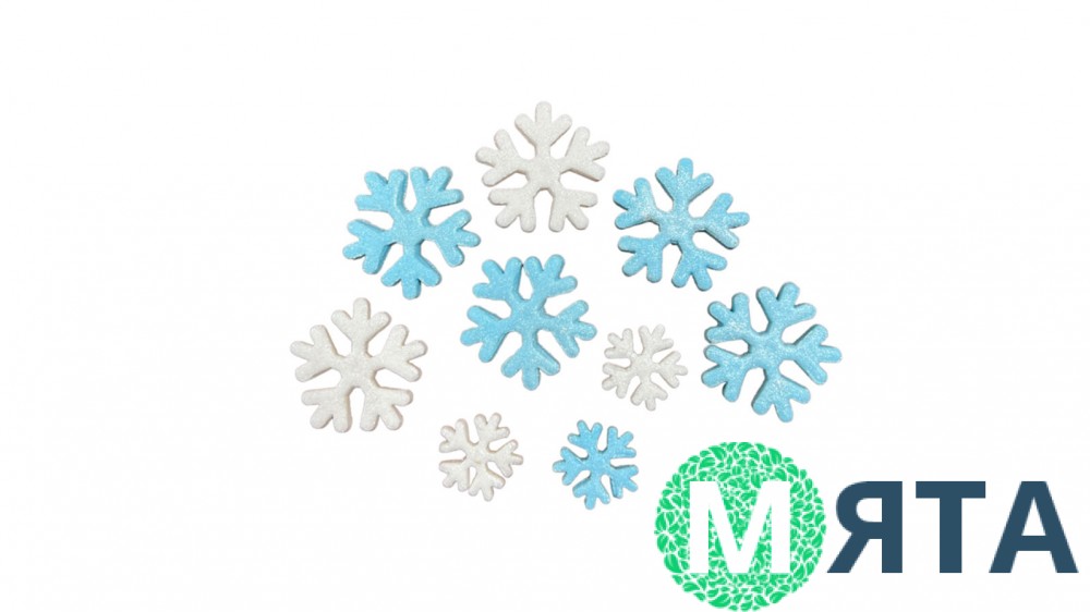 Набір цукрових фігурок складається з дев'яти сніжинок різного розміру білого та блакитного кольорів.