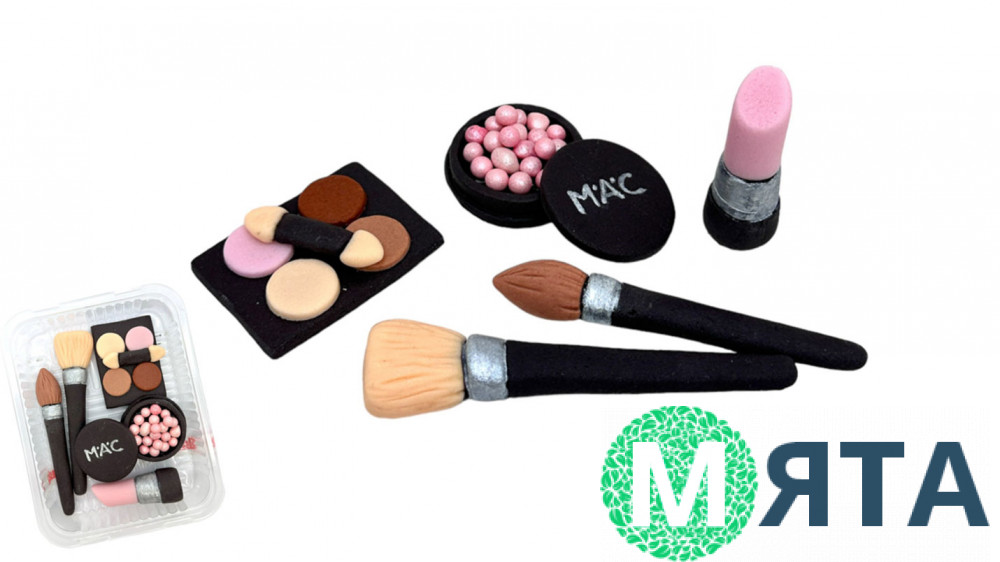 Розміри топерів у наборі Косметика: два пензлики довжиною 9,5 і 10 см; помада – 5 см; набір тіней з пензликом - 5,5 х 4 см; пудра – 4,3 см, кругла кришечка з логотипом – 3,6 см.