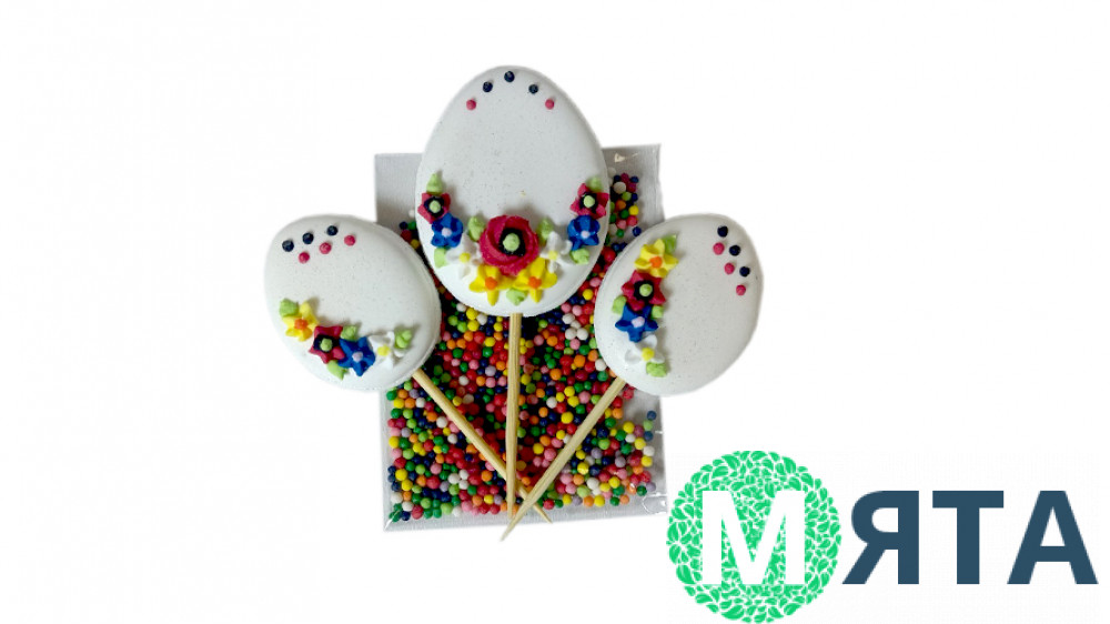 Набір складається з трьох яєць на шпажках: одне - 4,5х3,5 см і два по 3х2 см. Також в набір входить дрібна кругла посипка, яка підкреслить кольори великоднього декору.