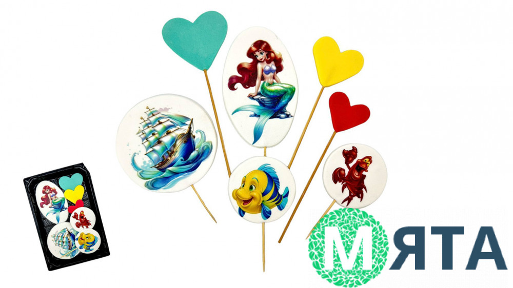 Великий круглий топер — діаметром 8,5 см, два круглі топери з рибкою і крабом по 5,5 см, овальний топер з Аріель 10,3 х 6,8 см і три серця 5,5х5 см, 4,5х4 см, 4х3, 5см. Усі топери на шпажках.