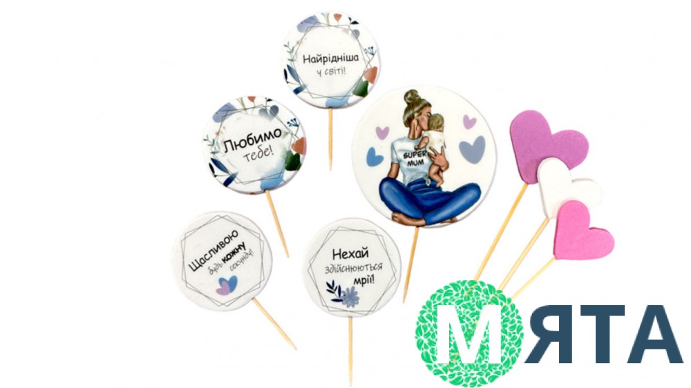 Великий круглий топер з жінкою та дитиною — діаметром 8,5 см, чотири круглі топери з побажаннями по 6 см, одне серце — 5х4 см, два серця — по 4х3,5 см. Усі топери на шпажках.
