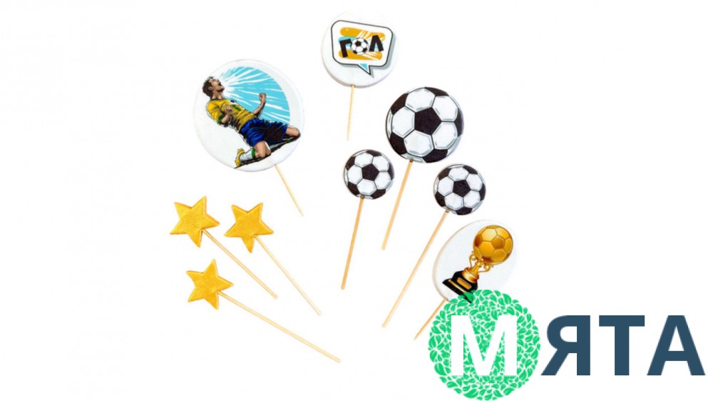 Топпер з футболістом у діаметрі 9 см, два маленькі м'ячі - по 4 см, великий м'яч - 6см, топер з написом "гол" - 6см, овальний топер з кубком - 7х5,5 см, три зірочки по 4 см. Всі елементи на шпажках .