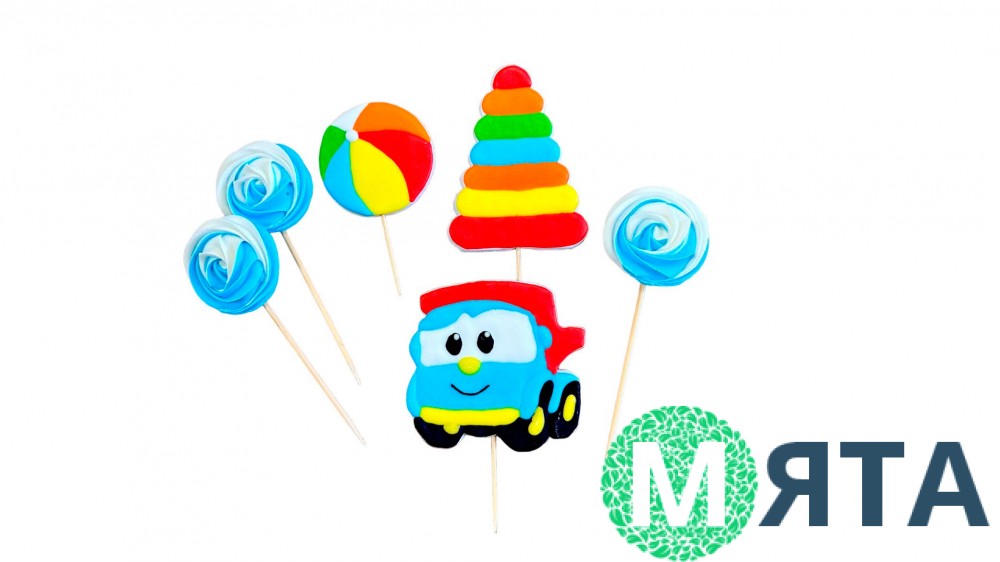Склад набору: вантажівка - 8*7 см, м'яч - діаметр 6 см, пірамідка 10*8 см, безе на паличці 3 шт - діаметр 5 см