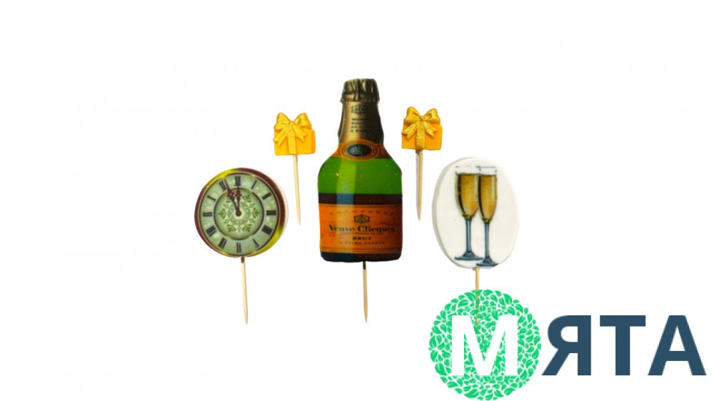 Набір складається з п'яти топерів на шпажках: пляшка шампанського - 12,5 * 6 см, овальний з келихами - 7 * 5,5 см, годинник - 6см і два подаруночки по 3 * 2,5 см. Розміри топерів вказані без шпажек.