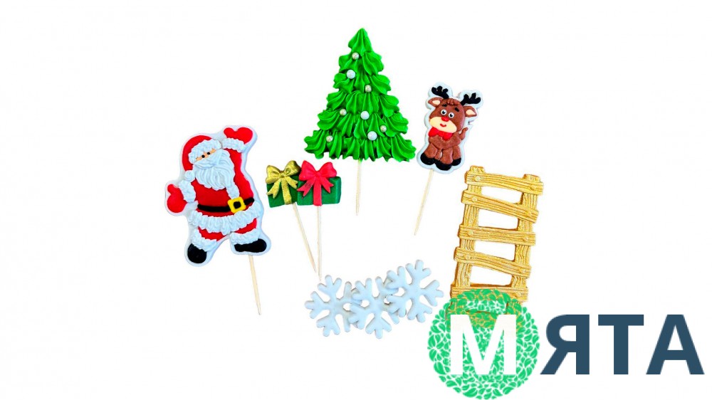 Набір складається з дев'яти елементів: Дід Мороз на шпажці 9 см, ялинка на шпажці 9 см, оленя на шпажці 6 см, 2 квадратних топера у вигляді подарунків на шпажках - по 3 см, драбинка - 10 см і три сніжинки по 4 см. Розміри топерів вказано.