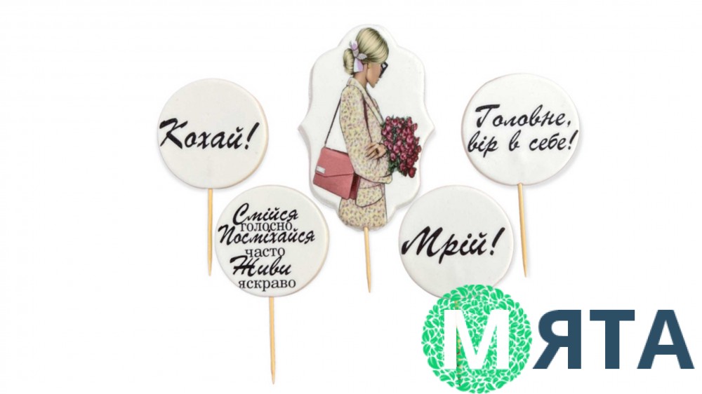 Жіночий набір цукрових топерів. До складу набору входить: топер з дівчиною, розмір 11*7 см, а також медальки з побажаннями – 4 шт, діаметр медальки 6 см, усі топери йдуть на дерев'яній шпажці.