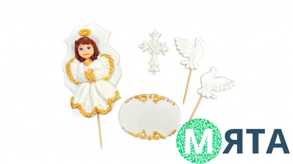 Склад набору: топпер з ангелом 11*6 см, хрестик 6*3 см, голуби 4*3 см - 2 шт, топпер для напису 6*5 см