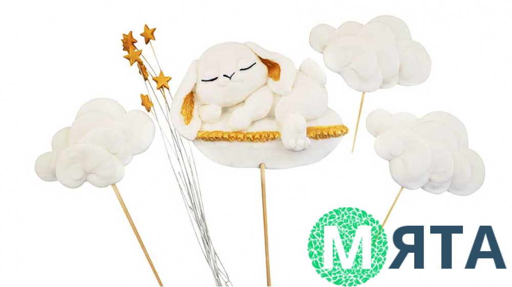 Набір цукрового декору зайчик на хмарах. До складу набору входить зайчик, хмарка – 3 шт, зірочки – 7 шт. Розмір зайчика 8*7 см, хмари 7*4 см, зірки до 1 см.