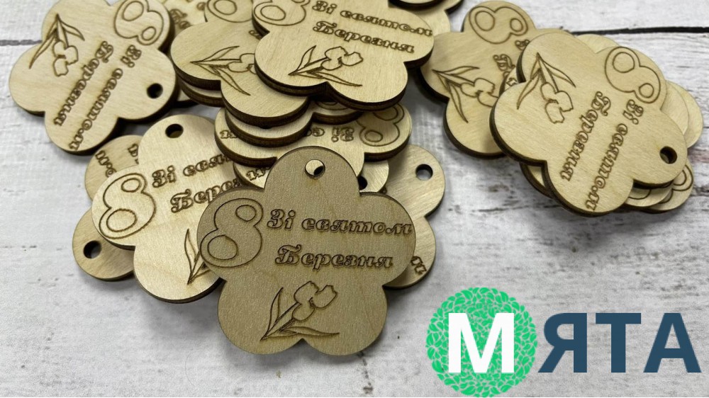Дерев'яна бирка у формі квітки з гравіюванням З 8 березня